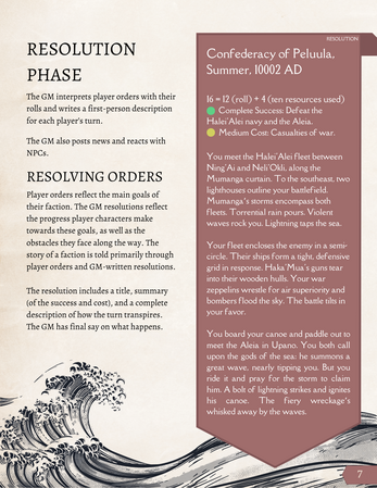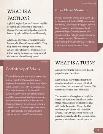 I enjoyed reading Factions, which is a quality product, worthy of your time. Having read it, I wish dearly that there were public examples of play available, especially since it is intended for play-by-post. Peter does include examples for one hypothetical player, but I still came away without a clear picture of Factions' intended PvP gameplay.