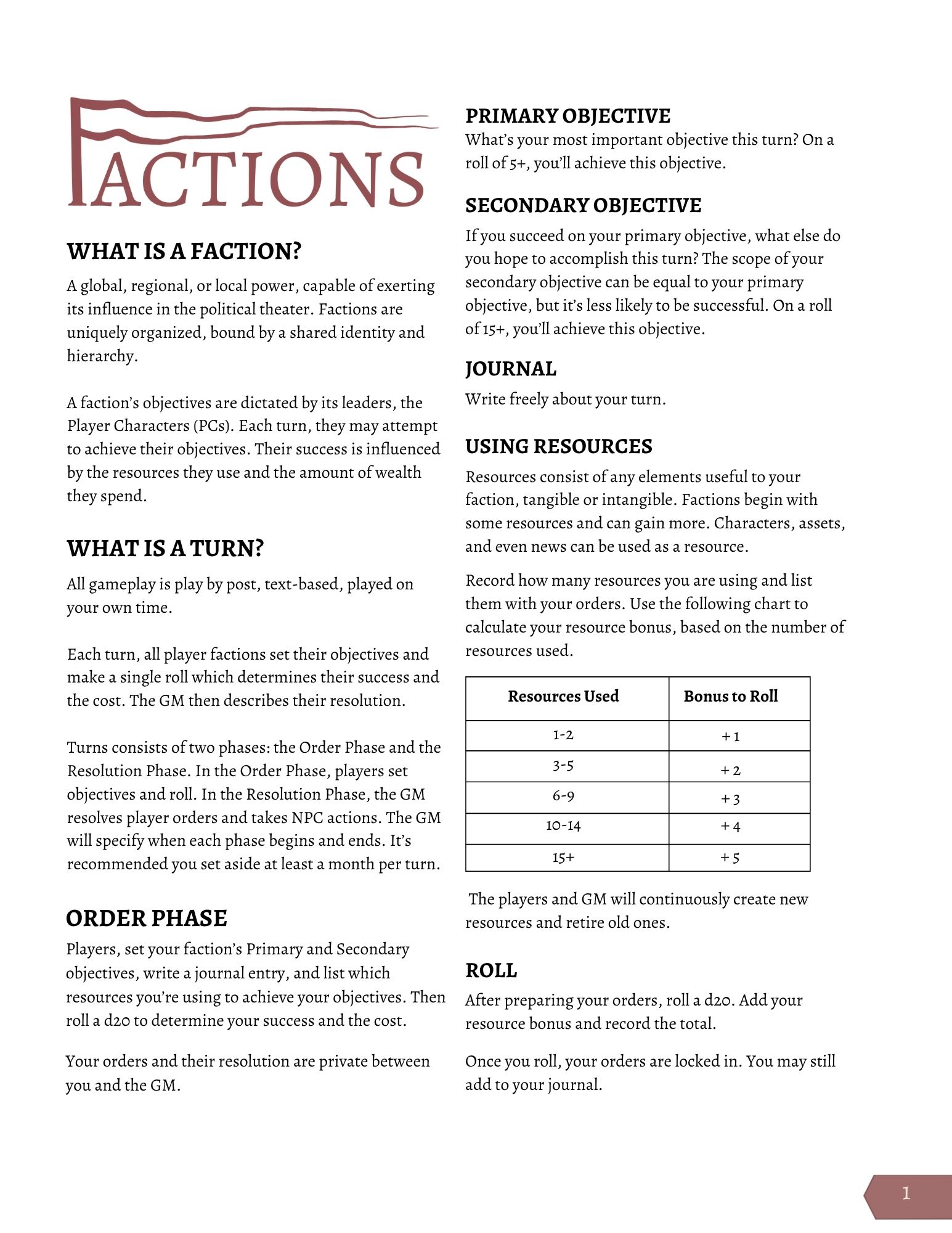 Factions is a Game Master led, play-by-post, tabletop role playing game, where you create your own faction and play as its leader. The rules are setting-agnostic, lite, and accommodate any writing ability.