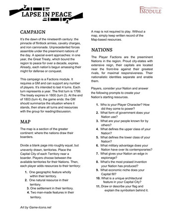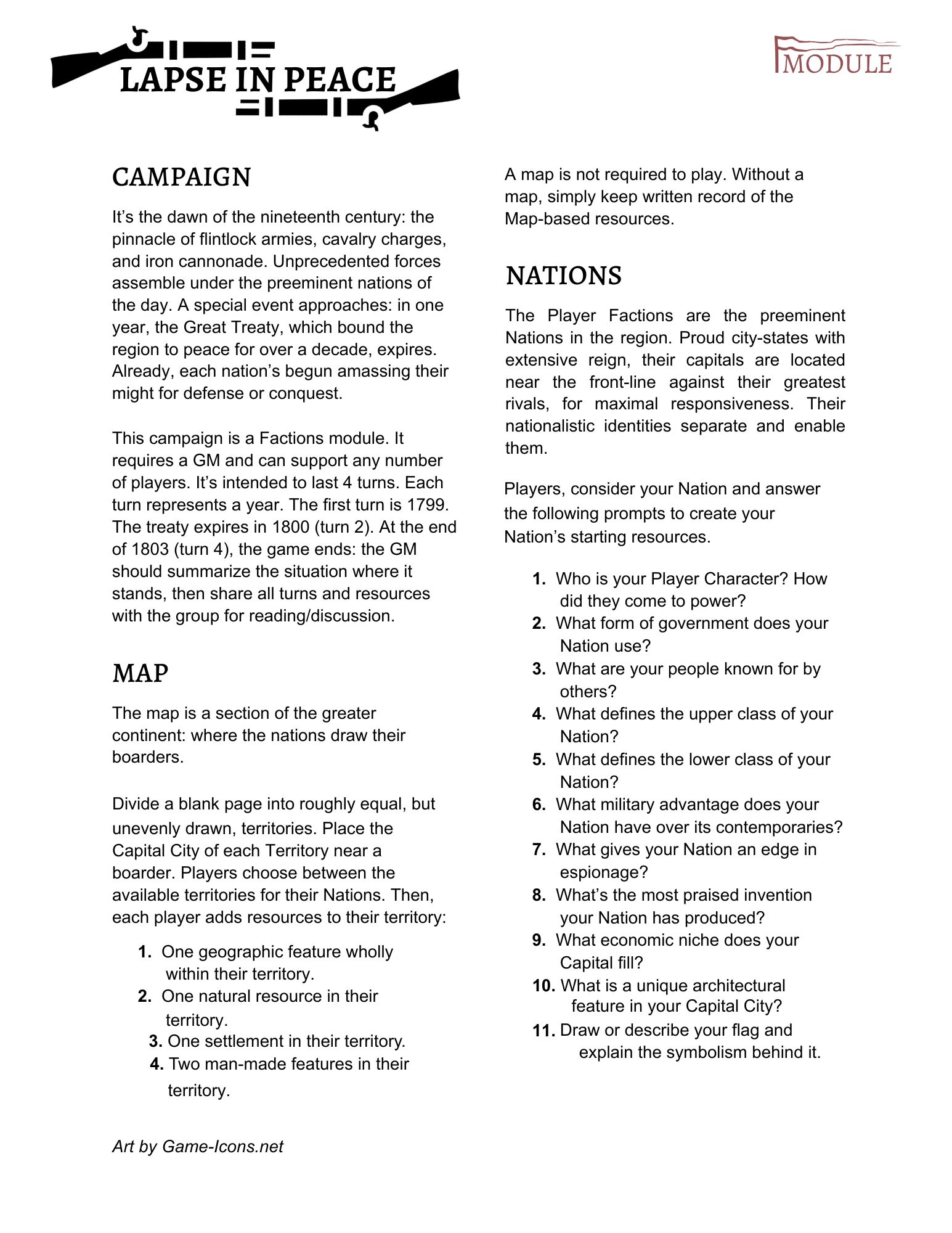 Lapse in Peace is a 1 page, minimalist module, about city-states in the 19th century who face their peace treaty's looming expiration.